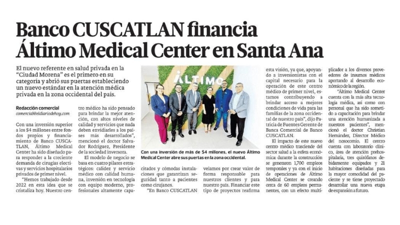 Áltimo Medical Center y Banco CUSCATLÁN fortalecen la salud privada en Santa Ana mediante una alianza que impulsa innovación, profesionalismo y bienestar para la comunidad.